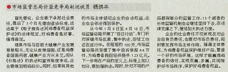維護良好的市場秩序,創造放心的消費環境,是我們共同的責任。企業要把市場主體第一責任人的責任落實好,發揚工匠精神,精于品質和服務,不斷創新,規范自律。各方齊心協力,進一步推動形成政府主導、部門協作、企業自律、行業自治、社會監督、消費者參與為一體的共治格局,促進行業的健康發展,維護好消費者合法權益,滿足人民群眾對美好生活的向往。