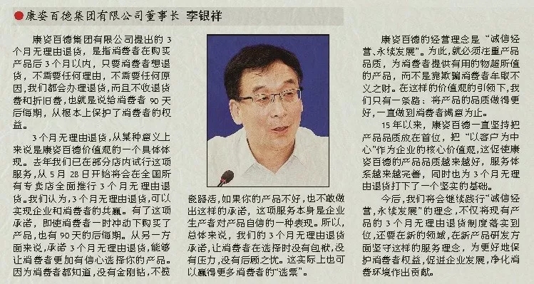 誠信贏天下。在當今的誠信經濟時代,創新、創意、差異化是每一個企業追求的情懷。康姿百德公司提出的3個月無理由退貨制度,反映了他們以消費者為本的精神,真誠希望他們能夠履行這項莊嚴的承諾,希望李銀祥董事長做一位創造價值的企業家,弘揚企業家的創新精神、工匠精神和敬業精神。真正的企業家應以家國情懷、以民族興旺為己任,以時代擔當和奉獻為最大追求,以滿足人民、滿足社會對行業、對產品最大的價值取向為目標。